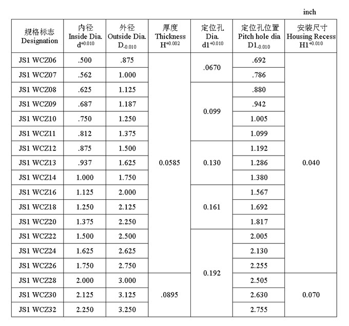 JS1 系列墊片英制尺寸