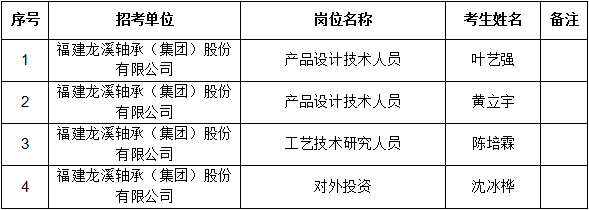 根據(jù)《福建龍溪軸承(集團(tuán))股份有限公司2022年公開(kāi)招聘方案》有關(guān)規(guī)定,經(jīng)面試等程序,現(xiàn)將公司擬聘用人員予以公示,公示期為5個(gè)工作日,公示名單如下: