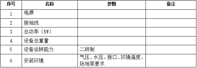 3.設(shè)備其他技術(shù)指標(biāo):(需含設(shè)備總功率、電壓、電流、氣壓、水壓、接口、環(huán)境溫度、場(chǎng)地等安裝環(huán)境有關(guān)要求)