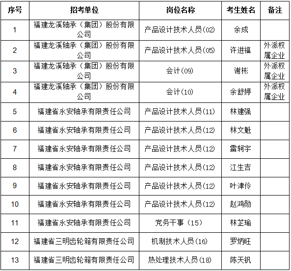 根據《福建龍溪軸承(集團)股份有限公司2023年公開招聘公告》有關規定,經面試等程序,現將集團本部及權屬企業(福建省永安軸承有限責任公司、福建省三明齒輪箱有限責任公司)擬聘用人員予以公示,公示期為5個工作日,公示名單如下: