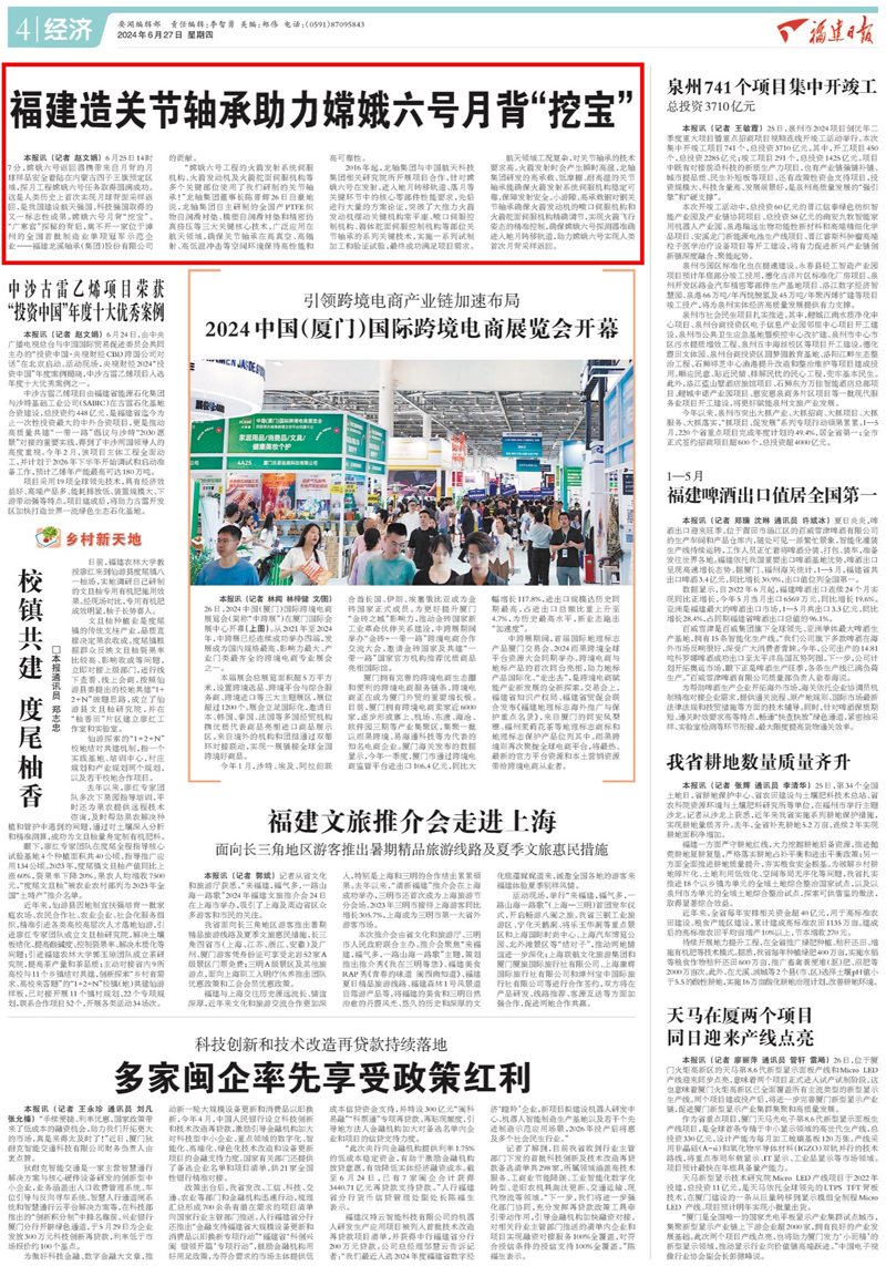 6月25日,探月工程嫦娥六號任務取得圓滿成功,實現世界首次月球背面采樣返回。6月27日,《福建日報》刊登《福建造關節軸承助力嫦娥六號月背“挖寶”》,講述龍軸集團以深厚的家國情懷和高度的政治擔當,多年來傾力服務國家航天事業,以“關鍵小器”保障嫦娥六號月背“挖寶”。