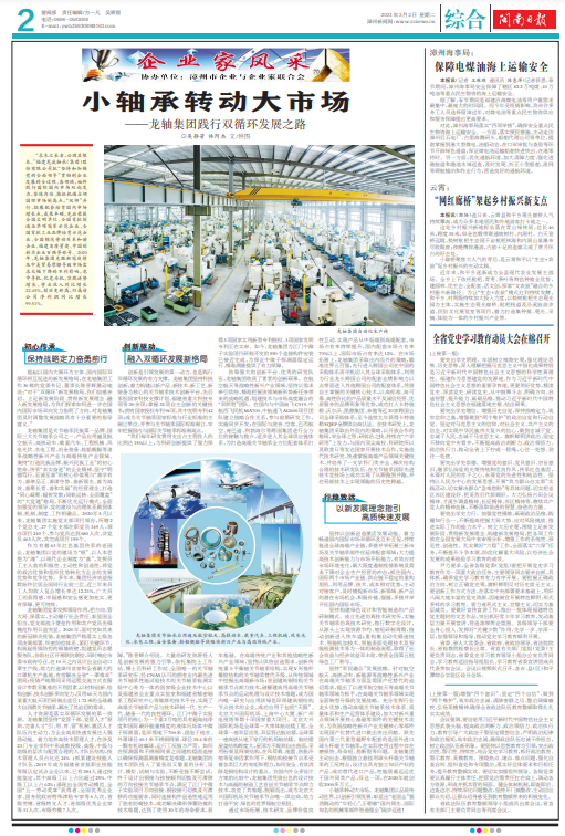 “求木之長者,必固其根本?!备=埾S承(集團)股份有限公司把“堅持和加強黨的全面領導”貫徹到企業發展的全過程、各領域,始終踐行國際國內市場雙向發力,苦練內功、搶抓機遇占領國際市場制高點,“雙師”并行、拓展配套培育國內市場增長點,成果豐碩,先后榮獲全國文明單位、全國首批制造業單項冠軍示范企業、全國首批工業品牌培育示范企業、全國模范勞動關系和諧企業、福建省質量獎、中國創新力企業百強等稱號。2020年,龍軸集團克服新冠疫情及中美貿易摩擦導致市場需求大幅下降的不利影響,危中尋機、化危為機,實現逆勢增長,營業收入同比增長22.45%,創歷史新高,歸屬母公司凈利潤同比增長99.51%。