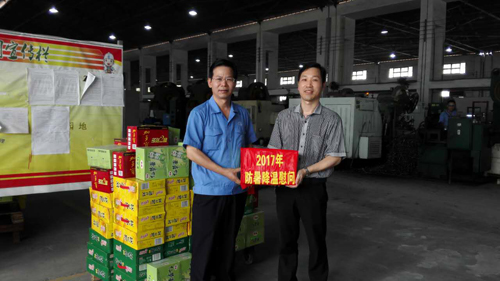 ????2017年8月21日下午,公司黨委書記董事長曾凡沛、總經理陳晉輝、副總經理張逸青、工會主席康安偉一行前往金田公司鍛工車間、車工一車間、車工二車間、成品五車間、熱處理車間等生產現場慰問堅守崗位的職工,并送去涼茶、菊花茶、冬瓜茶等防暑降溫物品,讓他們在炎炎夏日中感受到陣陣清涼。