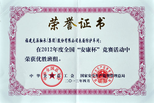 | 國(guó)家級(jí) | 2013年 | 全國(guó)“安康杯”競(jìng)賽優(yōu)勝班組(表面防護(hù)車(chē)間) | 中國(guó)總工會(huì),國(guó)家安全生產(chǎn)監(jiān)督管理總局 |
