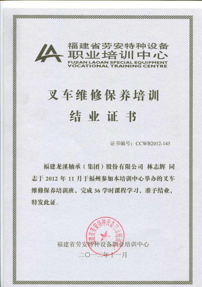 叉車維修保養培訓結業證書