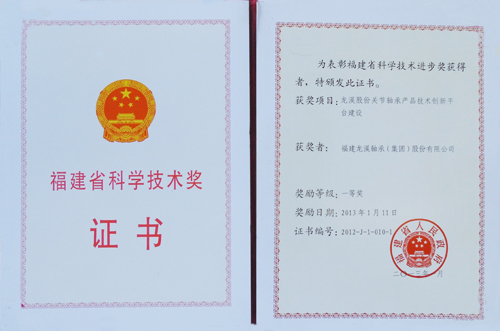 公司關節(jié)軸承產品技術創(chuàng)新平臺建設喜獲2012年度福建省科學技術進步獎一等獎
